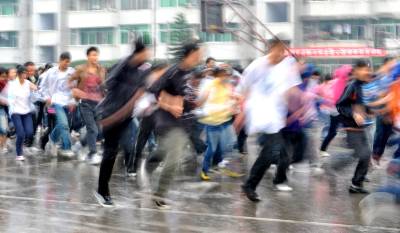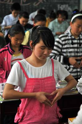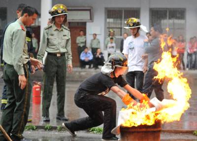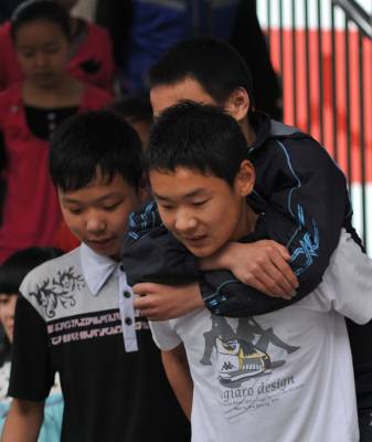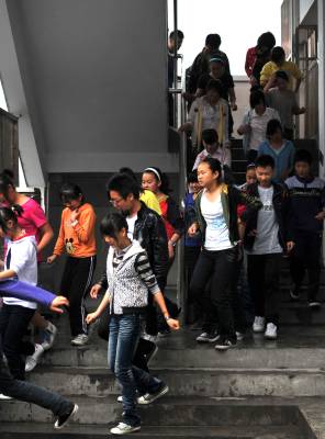 5月12日,恩施市龙凤高中进行紧急疏散演习(图一),一同学背着一名残疾学生随着人流从楼道口疏散(图二)。当天是全国”防灾减灾日”,为了强化师生安全意识,提高防范自救能力,该学校在举行紧急疏散演习的同时组织了消防安全演练(图三),同时用默哀的方式表达对汶川地震中遇难者的纪念(图四)。
