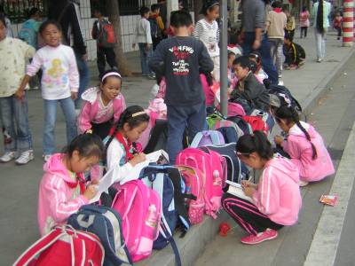 在武汉市江夏区某小学旁,每到放学时间,总有一些等车的孩子一边等车,一边在街边玩耍、做作业。视界网签约摄影师张超摄影