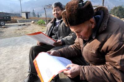 2月11日,恩施市新塘乡下塘坝村干部给村民廖泽章家送来了该村特制的新春贺卡,并仔细解释上面的内容。廖泽章拿着贺年卡高兴地说:"这个东西真好,比那些商店买的贺年卡片实用多了,这上面内容都是我们老百姓非常关心的东西,这几天我来给家人们好好读一读。"