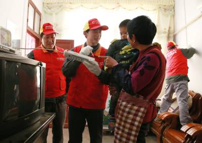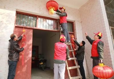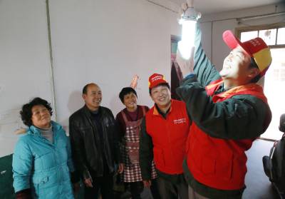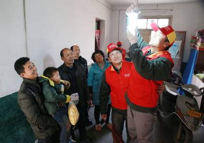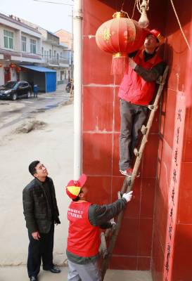 2015年2月12日,在湖北省孝昌县花园镇明华村,国网湖北省电力公司春节保电党员服务队队员在为村民接线并挂上大红灯笼及为居民进行安全用电检查。 春节即将来临,国网湖北省电力公司把春节保供电作为新年工作的首要之重,在做好各项保供电措施的同时,组织168支共产党员服务队对老弱病残、返乡过年等用户进行了走访,对辖区用户室内线路进行了一次安全隐患大排查,对一些老化的线路、失灵的设备、家庭漏电保护器进行了更换,并加强用电知识宣传。