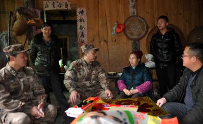 2月14日,恩施市新塘乡龚家坪村困难群众谭珍菊家,该市人武部官兵和谭珍菊一家拉家常。 当天,该市人武部官兵为龚家坪20户困难群众、现役军人家属、退伍军人送去大米、食油、棉被和新春对联,帮助他们打扫卫生、张贴春联、悬挂灯笼等,带去春节前的慰问和祝福。 l湖北图片库 周许 摄