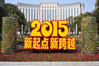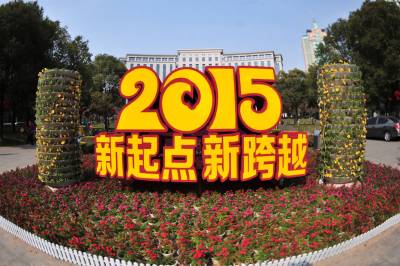 2015年2月13日,农历春节临近,宜昌市夷陵区街头绿化带中置放的“2015 新起点 新跨越”宣传牌格外引人注目,为新的一年经济社会发展开启新征程。 视界网 张国荣 摄