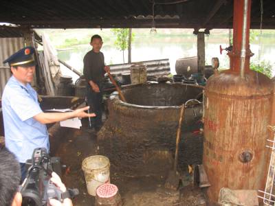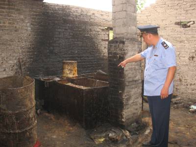 5月12日,随州市曾都区工商局南郊分局执法人员在一地沟油加工点检查。当日下午,曾都区工商局南郊分局在管辖区南郊平原岗附近一养猪场内,发现地沟油加工点,工商人员清查加工地沟油(半成品)260余桶,重量达50多吨,截至记者发稿,工商执法人员正在调查之中。本报视界网杨文明(牧野)摄