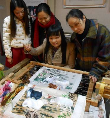 2月14日,湖北省武汉市武昌红巷艺术城,湖北省汉绣民间工艺技能传承大师黄春萍,正在加紧绣制《三羊开泰》的两幅佳作,只见这两幅作品上,不同色彩的6只羊,形态逼真,栩栩如生,神韵十足。她创作的《三羊开泰》两幅佳作,寓意着祝祖国和各族人民在羊年里三羊开泰,六六大顺,喜气洋洋。图为黄春萍(中)和她的学生,在一起观赏《三羊开泰》佳作。