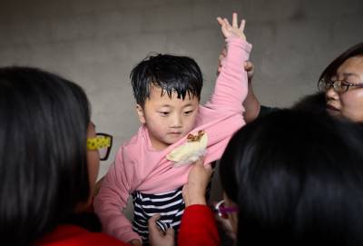 2月15日,义工们在为邹春花一家布置新家迎新年。