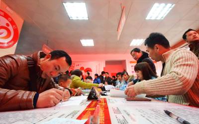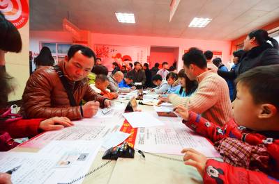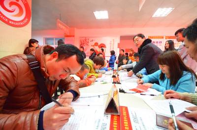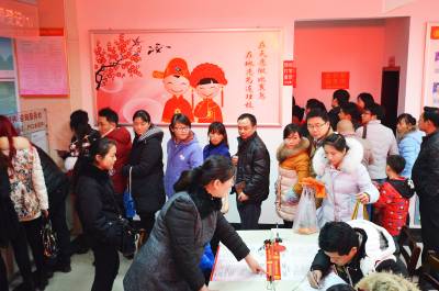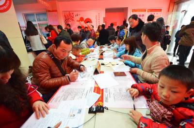 16日,云梦县民政局婚姻登记处人头攒动。春节前夕,当地外出打工的青年纷纷利用回家过年的机会扎堆办理婚姻登记,场面异常火爆。据了解,自1月中旬起,该登记处每天都要办理近100起婚姻登记,最多的时候高达100多起。 (王云清 摄)