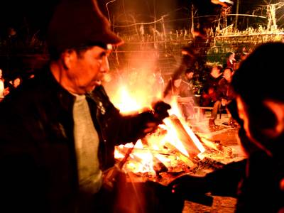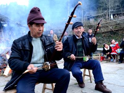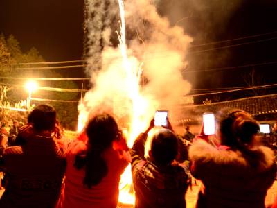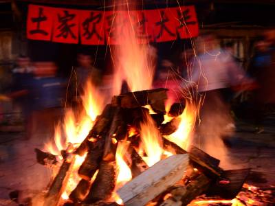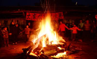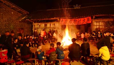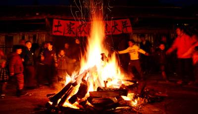 2月17日晚,来凤县革勒车镇豹子沟村3、4组张家大院子,村民围着篝火唱歌、跳舞,欢天喜地过大年。
