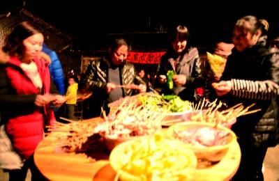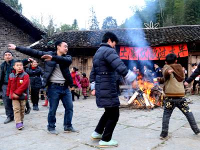 多年在外打工的张天学等20余位村民从亲人的电话里得知家乡交通、生活环境、就医、入学条件得到改善,相约回家陪父老乡亲过团圆年。他们自掏腰包4000多元,买鸡、鸭、鱼、肉及水果、瓜子、糖果请两个组的全体父老乡亲吃团年饭。近100多位父老乡亲围着篝火唱山歌、跳摆手舞、吃烧烤、拉家常、谈打算、话发展,共度团圆夜。