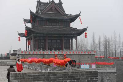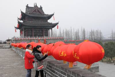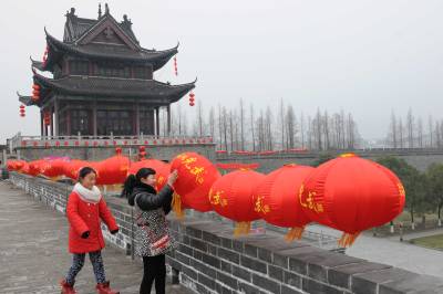 2月18日,农历除夕,在襄城仲宣楼城墙上,两名孩子在红灯下嬉戏。羊年春节来临,古城襄阳各处张灯结彩,喜气洋洋,一派祥和。