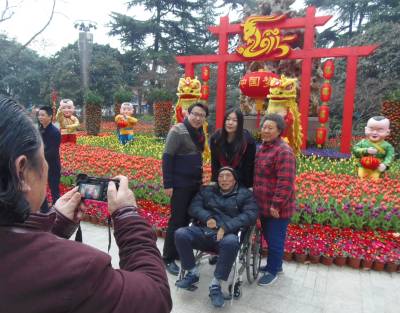 2月18日是大年三十。湖北省武汉市解放公园举行的2015武汉园林郁金香花展,东方文明古国的舞狮羊年中国梦美景与西方文明的郁金香完美结合在一起,共庆新春羊年的到来。在舞狮羊年扎景前,瞧这一家在拍家和万事兴的全家福,喜气洋洋庆羊年佳节的到来。