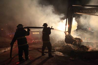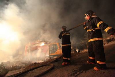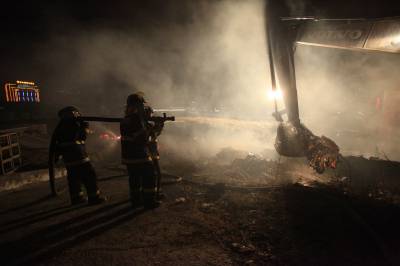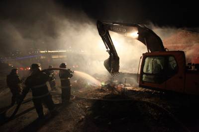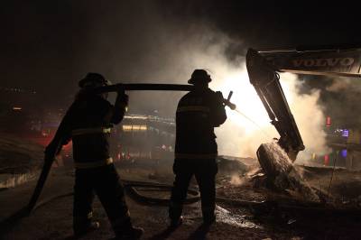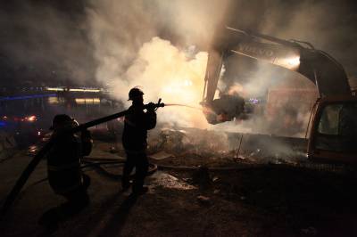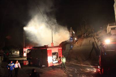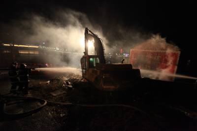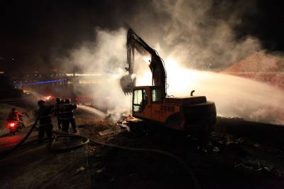 2月18日晚,消防官兵在竹山县城关镇莲花村一农户家灭火。当日是除夕夜,19点40分左右,竹山县城关镇莲花村一农户因燃放鞭炮引发堆放柴火的简易房屋起火并蔓延至住房,严重威胁到农户的安危,情况十分危急,急需救援。接到报警后,竹山县消防大队迅速出动3辆消防水罐车、一台挖掘机和25名消防官兵火速赶赴现场。21时10分,火势得到有效控制,现场指挥部调集力量对残余火势进行清理。23时20分,大火被成功扑灭。火灾没有造成人员伤亡。(视界网 章磊 摄)