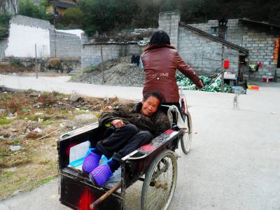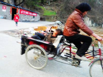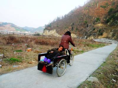 羊年大年初三,郧阳区五峰乡大石沟村一组村妇刘先英一家及其女儿女婿到两里外的本组妹夫家去拜年。刘先英现已90岁的婆婆年龄大了,行动不方便,孙女婿汪蕾将老太婆背上自己的轿车,准备带着老人一起去。可是,老人一上车就晕的受不了,汪蕾只好将老太婆扶下车,准备另想别的办法。刘先英见此情形,连忙从檐下推出自己平时用来卖豆腐的脚踏车,把婆婆背上车,一路蹬着车,带着婆婆来到妹夫家,吃了一顿热闹、舒心的年饭。之后,刘先英又伸长脖子,使劲蹬着脚踏车,上下两面坡,硬是把婆婆带回了家。看到这情景,左邻右舍们无不夸刘先英是个孝顺、贤良的好媳妇。(视界网 周宗华摄)
