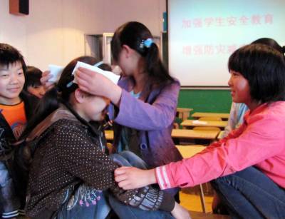 2010年5月12日,是我国第二个”防灾减灾日”,当天湖北省郧县刘洞中学的留守学生在老师的指导下为”受伤”学生包扎头部,练习应急包扎方法。本次留守学生通过学习防灾减灾的基本技能和自救互救应急常识,提高留守学生在突发灾难中的自救能力,增强留守在家的学生的防灾减灾意识。