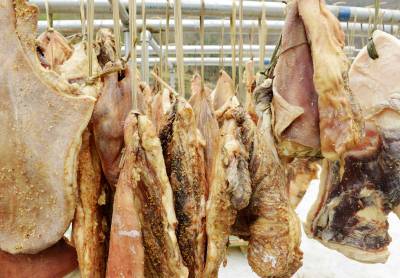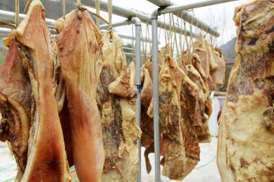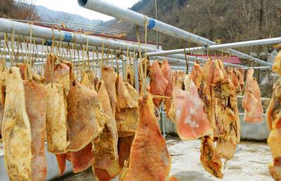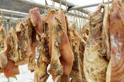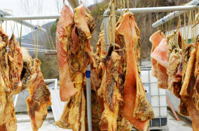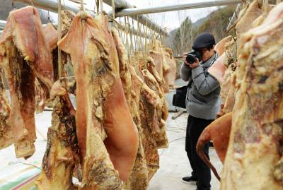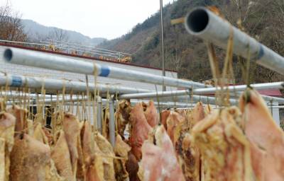 2月26日,拍摄的保康县过渡湾镇白峪沟村益农黑毛跑猪专业合作社,为武汉一大客户订制晾晒在楼顶的黑毛生态跑猪猪肉。 前天襄阳城市名人大酒店在该合作社一次性购买了500公斤黑毛猪肉。 据了解,保康县益农原生态黑毛猪养殖农民专业合作社从2010年开始养殖生态黑毛跑猪。喝无污染的甘甜山泉,吃山野绿色饲料,合作社喂养的生态黑毛跑猪全部放养在200多亩的山林中。去年销售黑毛跑猪1500余头,带动当地农民增收400多万元。(视界网 陈泉霖 摄)