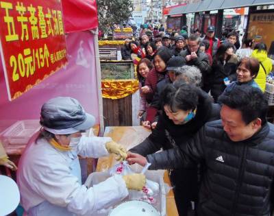 2015年2月28日,是羊年的正月初十。在湖北省武汉市“五芳斋”总店门前,门庭若市,人流如潮,排起了长龙,购买不同口味的袋装盒装汤圆。尤其是新鲜现做的“老元宵”叠式汤圆,由于制作完成需要20多道工序,等待时间较长达几个小时,有不少人冒着倒春寒风排队等候,总店为方便消费者购买,实行了排队按人发号票,每人30个的限量供应,但仍供不应求。现做的新鲜叠式汤圆,他们图的就是家和家事兴的团团圆圆,他们的心里喜洋洋,品味的是舌尖上的中国传统饮食文化。
