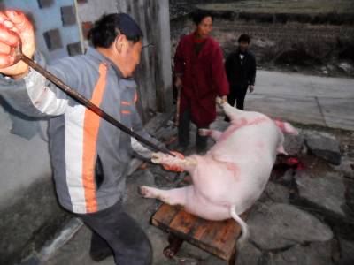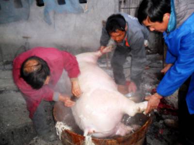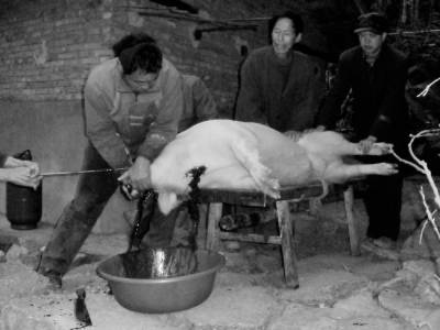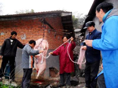 杀猪有捉猪上杀凳、递刀放血、捅气道吹气、开水烫刨猪毛、下猪头猪蹄、开膛破肚、翻肠子整肚子、劈边、拆侧油、分割猪肉、烙铁烙猪头猪蹄等十几道工序。