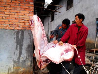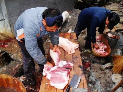 杀猪的习俗很多:亥日不杀猪,因为这一天是猪的本命日;子日也不杀猪,否则来年喂的猪如同老鼠大小。杀猪佬递刀时,忌刀尖对准堂屋,要刀尖朝屋外,且要白刀子进红刀子出,一刀杀不死则为不吉利。分割猪肉有一定之规,不得随意乱动刀。猪尾巴要拴在猪头上,叫有头有尾,民俗中用于大年三十敬神和敬祖宗。刀口肉又名“刀首肉”,指紧挨猪头的一块肉,主要留到七月十三过月半,敬先祖亡人(请亡人吃饭)。中间最长部位的肉叫“当厢肉”,如家中有儿子要娶媳妇,作为聘礼送到女方家,还要连着四至六根肋骨,此时的这块肉叫“吊子”。下猪蹄有大小之分,大蹄带骨,小蹄不带骨,带骨者留着,准备给坐月母子的人家送礼,或者预测家中生小孩,给月母子吃了发奶。猪肉有膘无膘用指头横量,俗称一指膘为瘦,二指瞟为不肥不廋,三指膘为肥,四指膘为大膘肉。此组纪实片拍摄地点是宜昌市夷陵区分乡镇棠垭村,时间为2015年元月2日清晨,杀猪佬是55岁的崔光生,他已杀猪37年。(视界网 袁国悦摄)