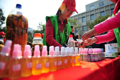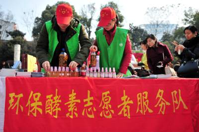 2015年3月6日,在宜昌市夷陵区庆“三八”慈善义卖现场,当地志愿者自制的环保酵素产品展台前,引来了不少市民的关注。这些环保志愿者通过讲解利用厨余垃圾发酵制作环保酵素的方法和产品性能介绍,以及日常生活垃圾的分类处理常识,倡导大家一起行动起来,增强绿色环保意识,做到“垃圾不落地、垃圾分类处理从我做起”。