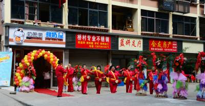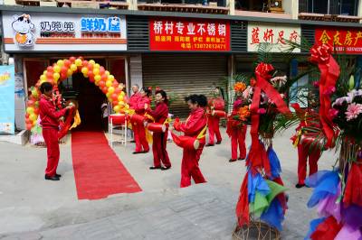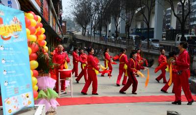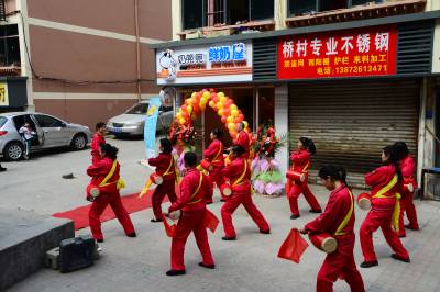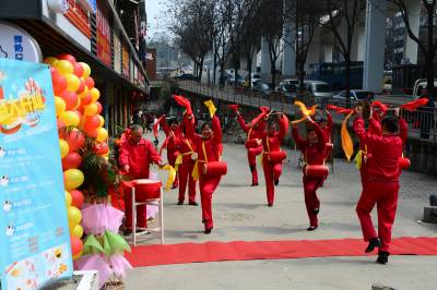 2015年新春伊始,万象更新。湖北宜昌城市禁鞭后,新店开张风气也随之一新,再也不闻“噼里啪啦”的鞭炮声,代之的是老年民俗腰鼓队的表演。图为3月9日,宜昌市胜利三路一牛奶店开业,请开腰鼓队在敲打表演。