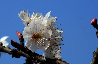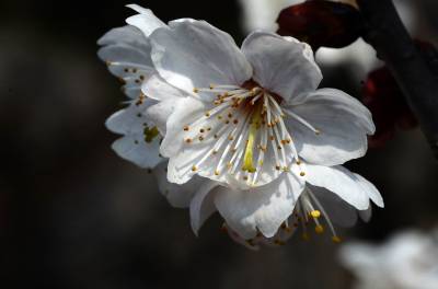 花序伞房状或近伞形,有花3-6朵,先叶开放;总苞倒卵状椭圆形,褐色,长约5毫米,宽约3毫米,边有腺齿;花梗长0.8-1.9厘米,被疏柔毛;萼筒钟状,长3-6毫米,宽2-3毫米,外面被疏柔毛,萼片三角卵圆形或卵状长圆形,先端急尖或钝,边缘全缘,长为萼筒的一半或过半;花瓣白色,卵圆形,先端下凹或二裂;雄蕊30-35枚,栽培者可达50枚。花柱与雄蕊近等长,无毛。核果近球形,红色,直径0.9-1.3厘米。花期3-4月,果期5-6月。