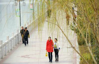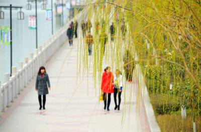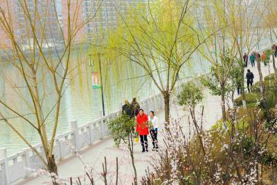 3月11日,游客在绿柳拂堤的保康县城清溪河河边走过。 位于鄂西北大山深处的山城保康春天姗姗来迟,山外早已是繁花似锦,山里刚刚杨柳吐绿,桃花初绽。行走在保康大地,呼吸里都是春天的味道。(视界网 陈泉霖 周立静 摄)