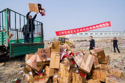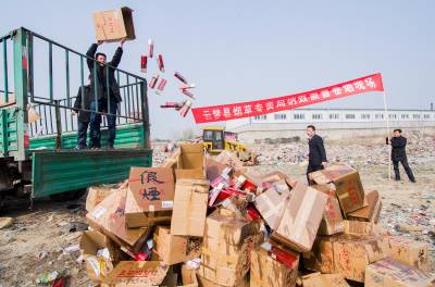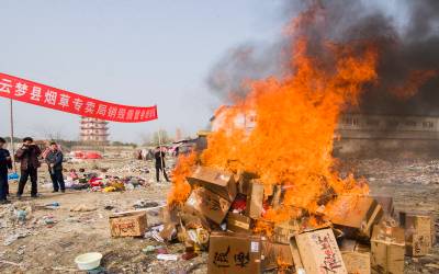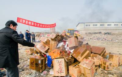 为了严厉打击制售假冒伪劣卷烟行为,维护国家利益及广大消费者的合法权益,12日,云梦县烟草专卖局联合当地工商部门在倒店乡垃圾填埋场对近两年收缴的假烟和霉变卷烟进行公开销毁。此次焚烧的假烟共有14个品种、4322.1条、价值31万多元。 (王云清 摄)
