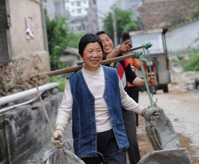 义务修路居民扁担”娘子军”5月15日,建始县业州镇草籽坝社区一支义务修路女居民”娘子军”正用扁担担这一沙,赶往社区路基改造工地。近年来,见县里花大量资金着力解决生活在县城被街小巷居民行路难,广大居民更是主动投身义务改造路基工作中,涌现出这样一支支修路扁担”娘子军”。本报视界网刘波建始县新闻中心刘波联系电话13032794298