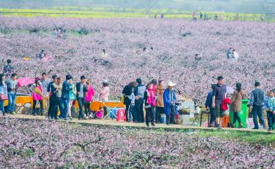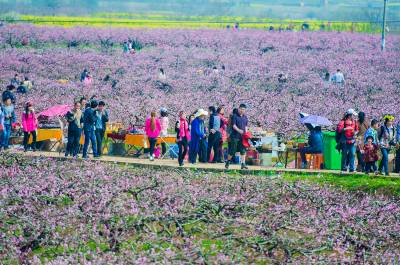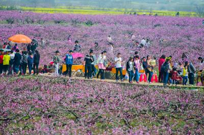 21日,雨过初晴的杨店万亩桃林芳华四溢、游人如织。当日,2015年中国·孝感(杨店)桃花文化旅游节在孝南区杨店镇桃花驿文化广场拉开帷幕,花海绘就的浪漫春韵吸引数万名游客共赴“桃花之约”,观赏现代版的“桃花源”,体会乡村旅游的乐趣。去年,我省端出规模以上赏花观景点111个,为乡村旅游吸金800多亿元。省旅游局相关人士认为,今年则有望突破千亿元。