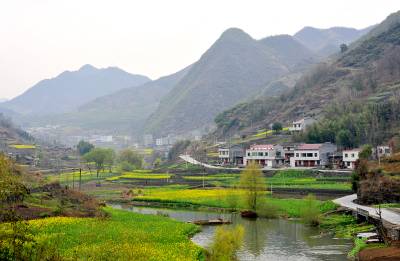 竹山县得胜镇石底村河水清清,油菜花盛开,将小村装扮得非常美丽,宛如桂林山水的浓缩版在竹山境内重现。