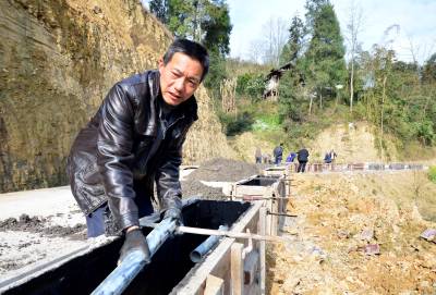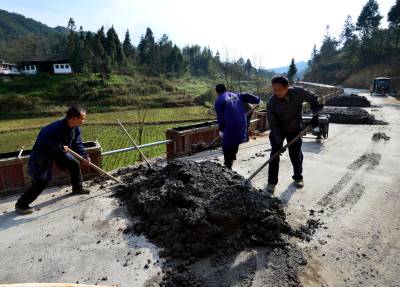 3月23日,咸丰县朝阳寺镇的通村公路上,工人正在抓紧建设安全防护墩。为加快推进“村村通客车”工作,咸丰县共投入600余万元,为具备通行条件的通村公路加装安保设施。(视界网孙东进、彭辉摄)