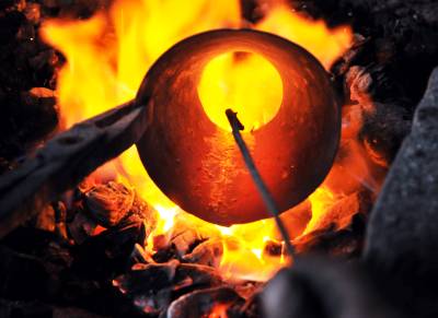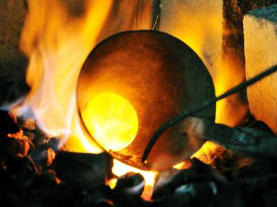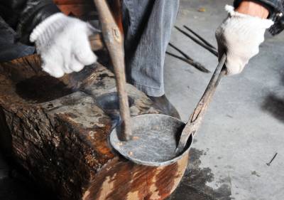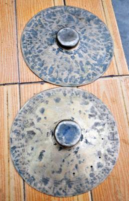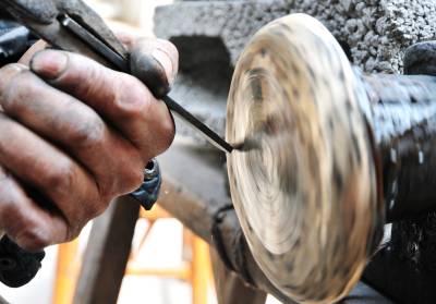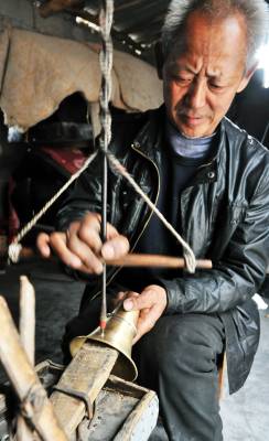 “无论打制什么铜器,一般要经过四道大工序,首先化铜制坯,其次打制半成品,然后画样造型,最后起窝成型,细锉车磨。最讲究心到、眼到、手到、力到,把握好火候。”韩永军自豪的说。同时,学铜匠最难学的是打制响器,这也是韩门铜匠世家的拿手绝活。打制响器必须用响铜,响器完全以传统手工工艺敲打加工制作而成,做工考究,工艺复杂。