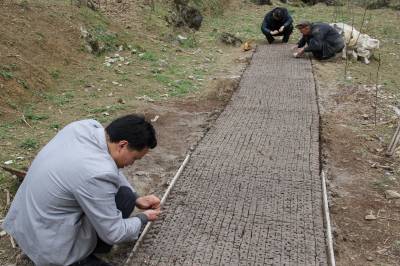 26日,鹤峰经济开发区第五轮“三万”活动工作队到太平镇槐树庄村一组4岁的何哲述家田里,帮忙做包谷营养块。