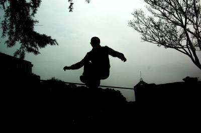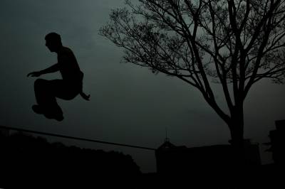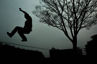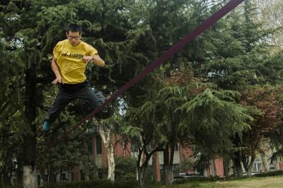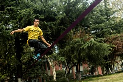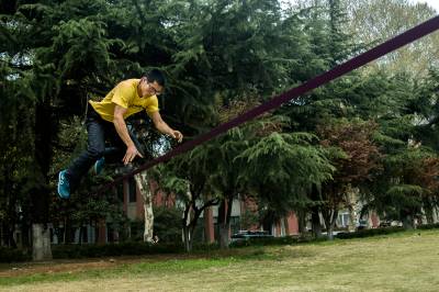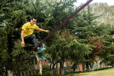 2015年3月29日,湖北省武汉市,华中师范大学,一名学生踩在空中的尼龙打包带上来回跳跃,空翻,进行平衡动作表演,这是近年来在湖北高校大学生中兴起的“走扁带”极限运动。这种扁带只有5厘米宽,因为有韧性左右上下摇摆不定,大学生极限运动爱好者可以依靠“扁带”玩出各种令人惊奇的动作。