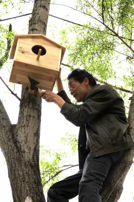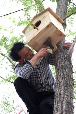 3月31日,竹山县林业局工作人员将自己制作的50个木鸟笼悬挂在堵河青年林里离地面8米高的柳树上,给林子里的鸟儿“安家”创造了优美的环境。