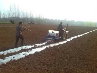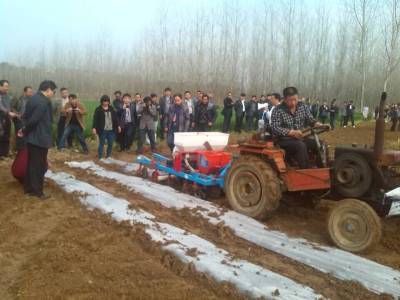 播种、施肥、喷施除草剂、覆膜、覆土5道花生播种工序机械一次完成。据河口富民农机合作社社长顾立新介绍,一台花生播种机一天可完成播种超过50亩,效率是人工播种的数十倍。大悟是全省花生种植大县,花生种植面积达到29.8余万亩。花生的种植季节性强、用工多,劳动强度大,尤其花生播种工序繁多,要求严格。推广机械播种花生,不但结束了花生播种靠人工的历史,减少劳动强度,而且比人工播种亩平节约成本100余元。通过机械播种晚杂9102号等优质高产花生新品种,亩产收成可达400余公斤,种植效益翻一番,机械播种花生将极大推动大悟花生产业发展。(视界网 易荣波 石小清 摄)电话:13098486288