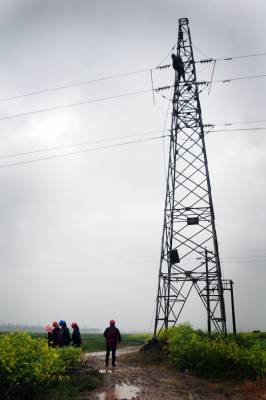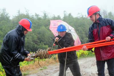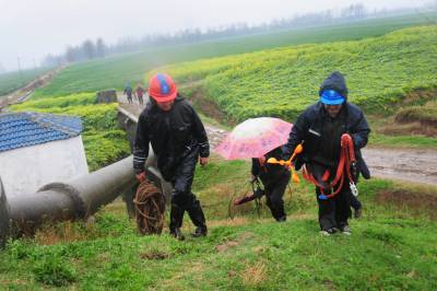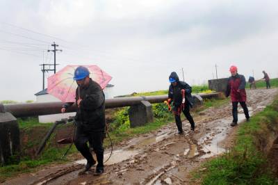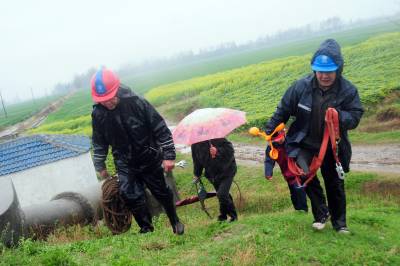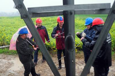 4月1日上午,在老河口市孟楼镇柴岗村北的泵站旁边,供电公司的抢修人员正在对35千伏薛孟线的故障进行紧急抢修。3月31日夜间,老河口市突降大雨,伴随4级大风,受此次天气影响,联络35千伏孟楼变电站和薛集变电站的第69号铁塔导线出现故障。从4月1日凌晨6点开始,该市供电公司组织的抢修人员迅速集结,冒雨对故障范围和故障点进行查找,并制定抢修方案。当天上午,抢修人员分为地面协作和登塔作业,对出现故障的铁塔导线展开紧急抢修。截止上午11时06分,抢修人员对受损的导线进行了修复和更换,并对铁塔构建和设备进行巡视检查,薛孟线抢修工作顺利完成。