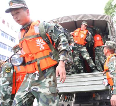 5月18日,武警荆门市支队组织官兵进行了一次抗洪抢险防灾实兵演练,以检验部队官兵的体能、反应速度、装备物资供给等方面是否适应汛情来临时的要求,确保抗洪官兵拉得出,打得赢。图为士兵在演练快速出击。本报视界网许中华摄