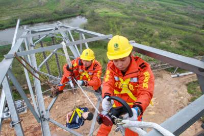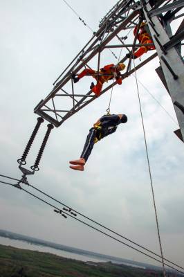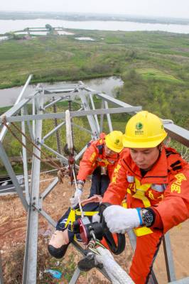 4月8日,在位于武汉市黄陂区的滠口培训基地内,湖北省送变电工程公司应急抢修中心员工正在实操高塔上,运用救生缓降器将一名发生感应电触电事故的模拟人下放至地面。该公司通过开展感应电触电事故现场处置模拟演练,检验各部门应急处置与协同配合能力,进一步提高全员自我保护意识和安全意识。