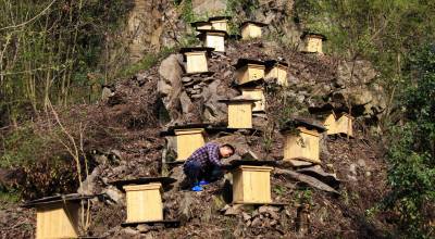 深山好养蜂 (图文) 竹山县宝丰镇中心学校 朱本双 电话:13177481456 邮编:442213 电子信箱:zsbfzbs@126.com 身份证号码:422624196910182052 4月9日,竹山县官渡镇百里河村一蜂农正在摆放新蜂箱。该村森林覆盖率达95%以上,水源充沛,植被茂盛,是蜜蜂喜爱的生存环境。近年来,该村成立百里河农民养蜂专业合作社,促进养蜂致富。目前全村有养蜂的村民达200多户,养蜂近1000箱。