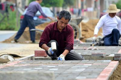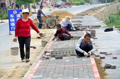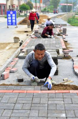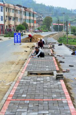 4月11日,在秭归县茅坪镇陈家坝村第11村落村民徐祖旺的家门口,工人正在加紧铺设人行道。据悉,陈家坝村作为三峡库区秭归县“美丽乡村”建设的试点村之一,目前正在按照全县的统一规划和标准,加紧建设居民点人行道、农户门前太阳能路灯、公路沿线文化长廊等基础设施,工程可望在今年6月底前完工,将明显改善村落群众的生活居住环境。
