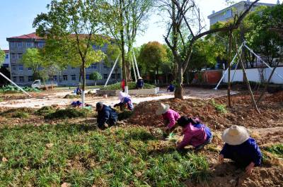 4月12日,在湖北省荆门市钟祥市长寿镇机关大院内,工人们正在补栽绿色植物。今年,该镇在“常年抓绿化”的基础上,筹资2万多元,定植四季青植物,进一步扩大绿化面积,美化机关环境(视界网 李景发摄)。