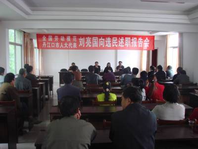 劳模代表双身份履职为民情更高5月19日,全国劳模、丹江口市人大代表刘亮国向自己所在的丹江口市习家店镇小茯苓村选民述职。年轻女青年刘亮国担任村委会委员、妇女主任、丹江口市人大代表,今年”五一”荣膺”全国劳动模范”。既是人大代表、又是劳模的刘亮国深感肩上的担子比原来更重,她在积极配合村里谋划新一轮发展致富、带领群众致富规划的同时,切实履行代表职责,进村入户,奔波乡间,广泛听取民意,收集意见、建议,向组织反映群众呼声,并调动全体选民积极为全村经济社会发展出力献计。图一为述职现场。图二为刘亮国正在积极做述职前的准备。图三为刘亮国在向选民述职。图四为刘亮国(右)在选民刘长娥家中收集意见、建议。龚运军叶金合何仁波丹江口市习家店镇人民政府邮编:442706