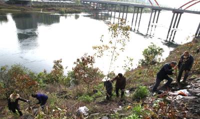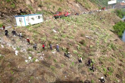4月13日,竹山县潘口乡悬鼓洲村民在堵河三桥沿河边栽植带土球的红叶楠。今年竹山县以“五城联创”为抓手,围绕“八绿”(山绿、路绿、河绿、城绿、园绿、村绿、院绿、地绿)工程,大力实施以河岸绿化为重点的“绿满竹山”行动,采用适合的建设模式和适合河岸生长的树种,把绿化建设与河流治理、水利工程等有机结合起来,着力打造“河畅、水清、岸绿、景美”的生态目标。目前已完成堵河沿线绿化12.5公里,绿化面积500余亩,既护岸固堤又美化环境。视界网(程平摄影)