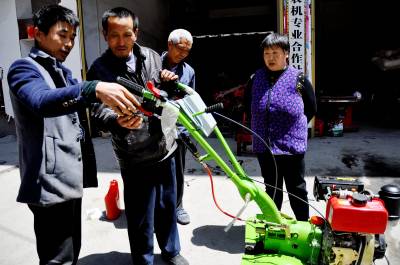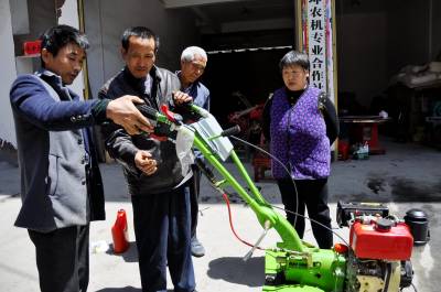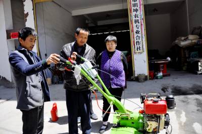 4月14日,在恩施市明坤农机专业合作社里,农民忙碌着选购微耕机。 眼下进入春耕春管关键时节,该乡农民选购小型农机具逐渐升温,纷纷前来咨询农机补贴政策,了解各种农机的性能、价格等情况,节能、耐用和易操作的“补贴”农机备受农民青睐。(视界网彭绍峰阮正斌摄)
