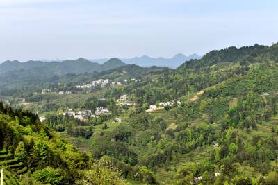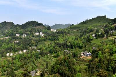 绿海人家 4月14日拍摄的恩施市芭蕉侗族乡灯笼坝村风貌。 蓝天白云下,特色民居点缀在绿海之中,一派勃勃生机,呈现产业发展与环境保护的双赢态势,成为城市居民假日休闲观光体验的好去处。(视界网 张艺馨 摄)
