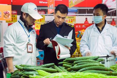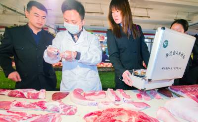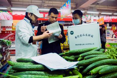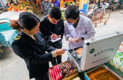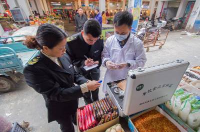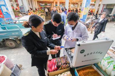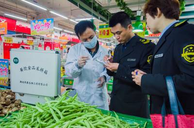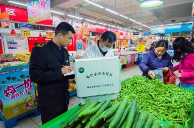 供参考的标题: 为了“舌尖上的安全” 4月15日,云梦县食品药品监督管理局执法人员在梦泽市场对新鲜蔬菜、水果、肉类、调料等农产品进行采样检验和快速检测。以“无公害蔬菜”著称的云梦,今年被列为首批国家农产品质量安全创建重点县,该局加大市场巡查、抽检力度,严防不合格农产品流入市场,确保市民“舌尖上的安全”。 (王云清 摄)