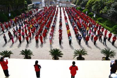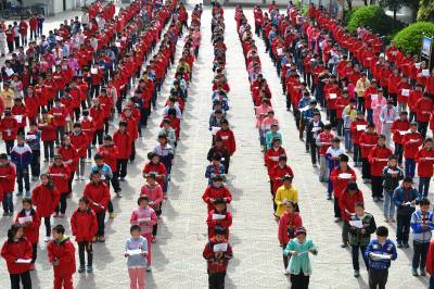 4月16日,湖北省十堰市郧阳区柳陂镇中心小学操场上,千名小学生在大课间列队欢唱《接过雷锋的枪》。