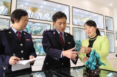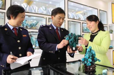 4月16日,竹山县国家税务局干部深入辖区绿松石经营户了解销售等情况。近年来,该县国税部门加大绿松石行业税收政策法规宣传力度,进一步规范绿松石市场经营秩序,坚持科学开发、集约发展、品牌经营、永续利用的原则,走绿松石产业转型发展之路。把绿松石与女娲文化、生态旅游、珠宝饰品结合,放大绿松石产业效益。2015年,全县绿松石产业力争实现产值50亿元、利税5亿元。