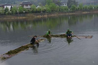 4月19日,利川市腾龙旅投集团的员工在打捞野猫水水库的杂草和垃圾,还水体洁净。该集团计划投资30-50亿元在此打造造集土家古镇、老年门球场、老年康复中心和度假公寓于一体的宜影古镇。项目实施过程中,该公司注重建设与修复生态同步进行,定期对项目范围内的水体、山体进行清洁,让山更绿,水更清。(视界网秦卫飞摄)