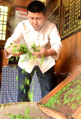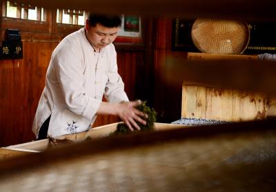 4月20日,湖北省恩施市“蒸青茶”新发展的传承人范锦武正在制作“恩施玉露”绿茶。